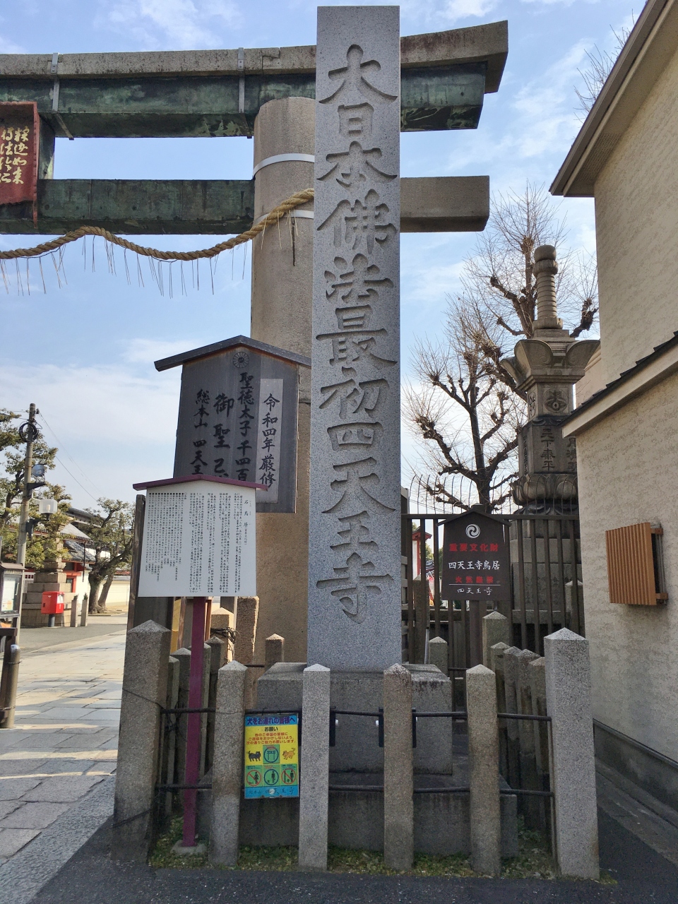 四天王寺の西側には、1294年に再建された重要文化財に指定されている石鳥居があります。石鳥居は神仏習合時代の名残として現存しています。そのすぐ隣に「大日本佛法最初四天王寺」と記された石碑が建っています。まだ新しく建てられた感じで、石鳥居の写真を撮ると、一緒に映っていました。