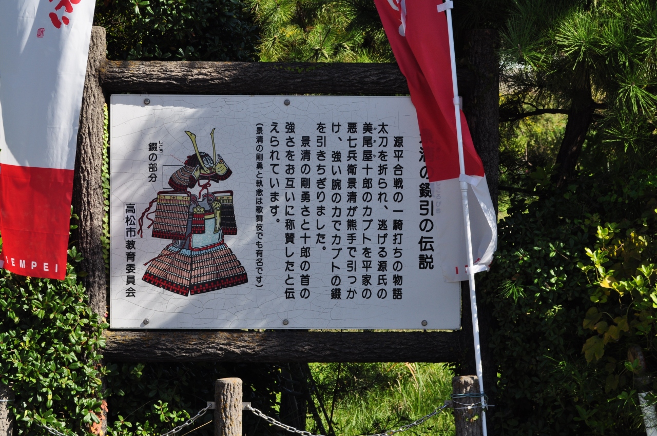 2020年10月に四国旅行で高松を訪問した際に立ち寄りました。屋島の東側、相引川を挟んで反対側にいくつか史跡が残されています。ここは平安時代末期の1185年に平家と源氏の合戦「屋島の戦い」の舞台となった場所です。屋島の戦いにおいて、源氏方の武将「美尾屋十郎」の兜の錣(首の後ろを守る部位)を、平家方の武将「悪七兵衛景清」が腕の力で引きちぎったという言い伝えがあるそうです。どこまでが事実なのかわかりませんが、当時の戦というものが単純な命の奪い合いではないという事がわかる出来事ですね。