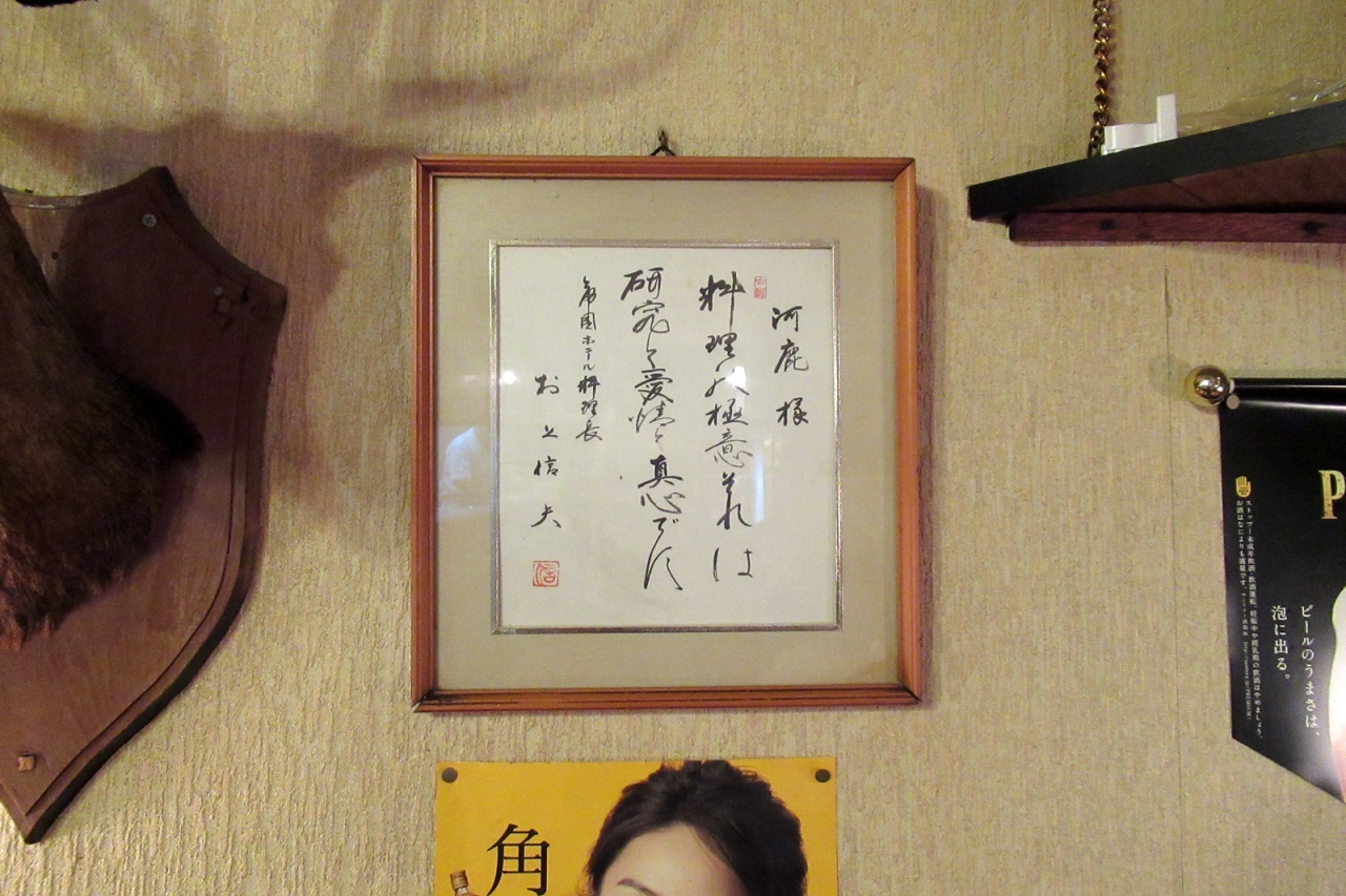 赤坂の洋食屋「河鹿」さんです。外観や店内はまさに学生時代に通った洋食屋さん、味も幼い時から食べなれた味わいで、とても和みます。店内の壁には、私自身が幼い時に憧れであった帝国ホテル総料理長村上信夫さんの色紙がありました。そう、あの時代の味がそのまま現代に受け継がれているのがが「河鹿」さんなんですね。懐かしさを感じられて当然なんですね。