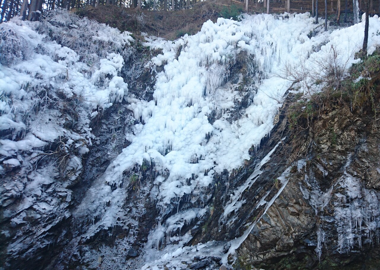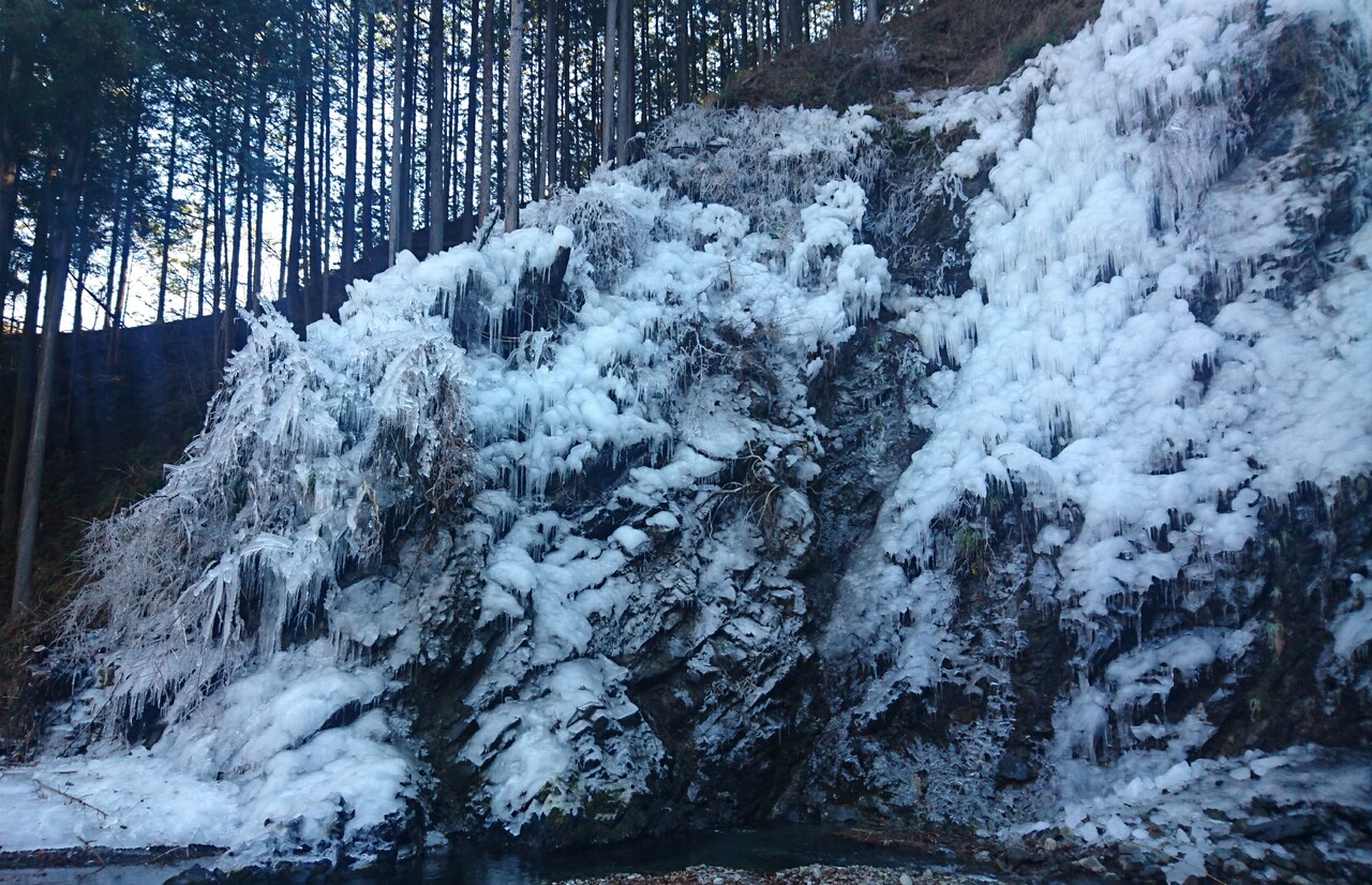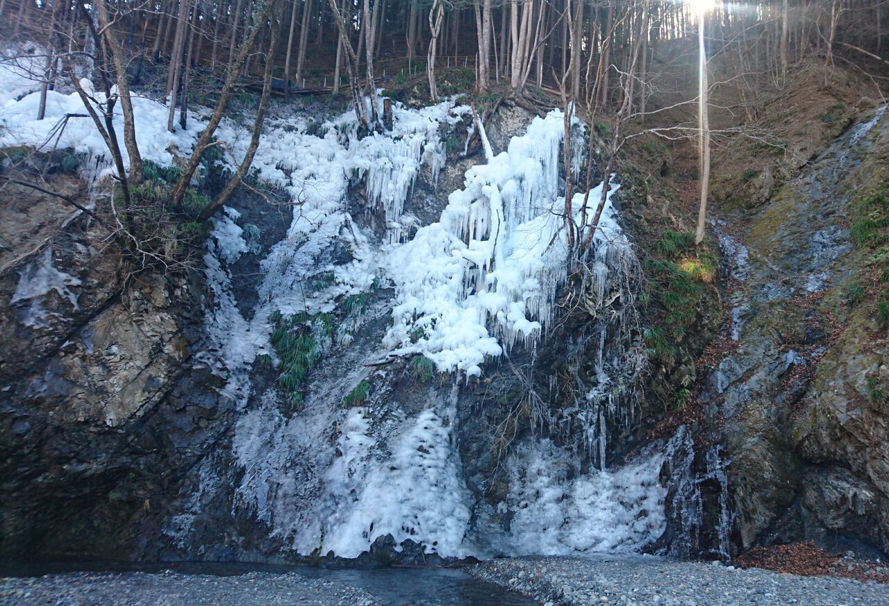 秩父から国道299線を走り、尾ノ内渓谷氷柱の6キロほど手前。助手席側から一瞬見える。駐車場は無料。のぼりがいくつか立っていた。坂を下ると川沿いの岩壁に氷柱があった。川は浅く橋もかかっていて岩壁の近くまで行けるようになっていた。上部から水が流れていた箇所があったので人工とわかる。駐車場には車が1~2台。秩父には三大有名な氷柱があるは、ひさつき氷柱は規模は小さいが穴場だった。