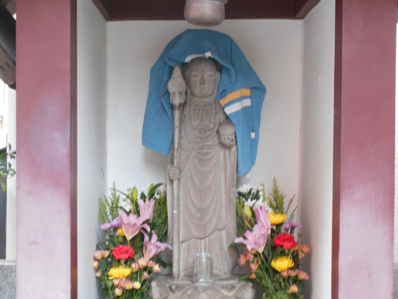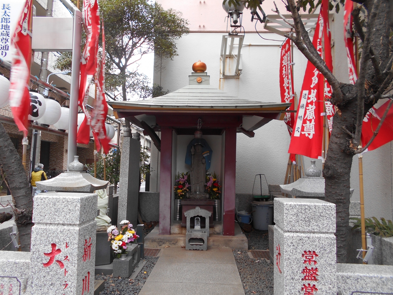 雷5656会館の西隣りに赤い幟が建ち並び一角に小さな拝殿があり、ひっそりと地蔵尊が祀られています。名前の道引きとはこの地蔵尊を信仰すれば浄土に導かれるという意味だそうです。元禄時代からあった地蔵尊で当時は馬場尻地蔵と呼ばれていたそうです。