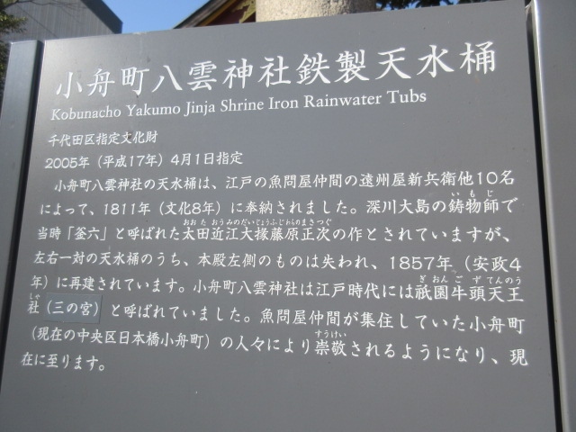 東京の神田明神に参拝に行きましたが、その境内にある八雲神社の一つです。句の指定文化財に認定されている大きな鉄の水桶があるのが特徴的です。お隣の八雲神社と同様、お祭りにかかわるそうで、スサノオを祀り、「三天王」のひとつ。石鳥居井の奥には三角の屋根で白と赤の建物が建っています。
