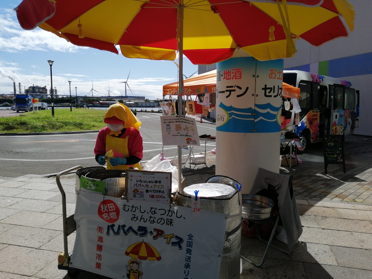 タワーと物販の間の通路でババヘラアイスの販売をしていて、ババヘラアイスの歴史を話しながらバラのアイスを作ってくれました。