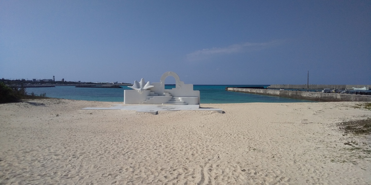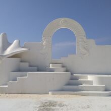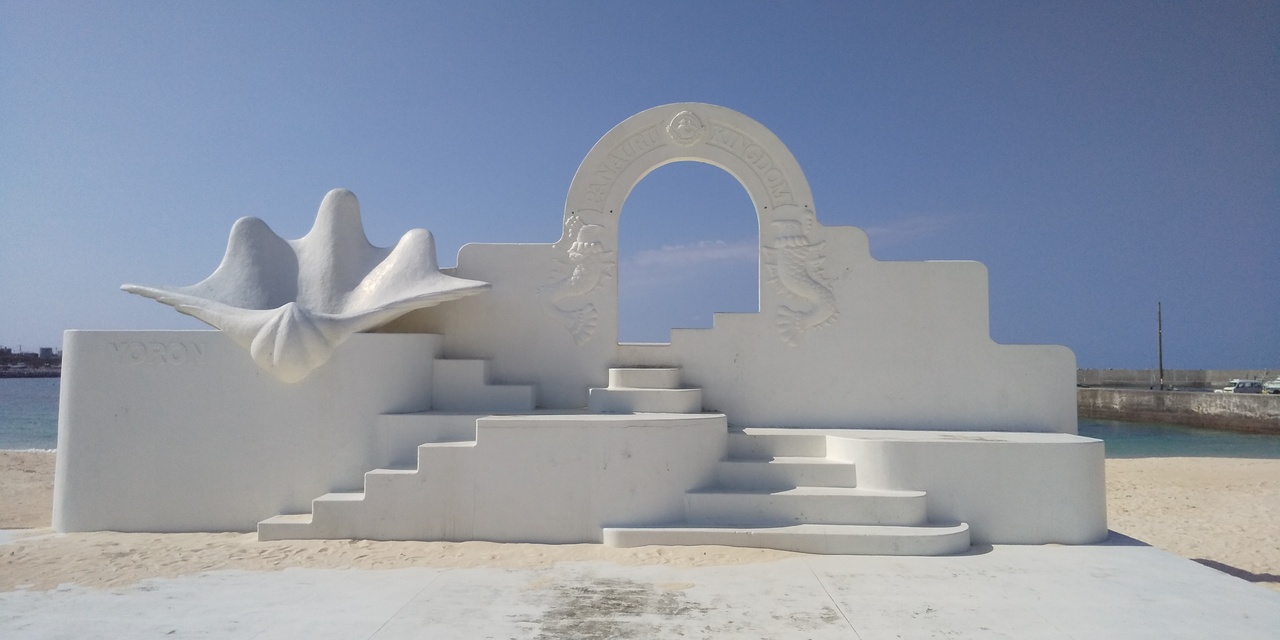 砂浜には、ヨロン共和国の白いオブジェがあり、フォトスポットになっています。