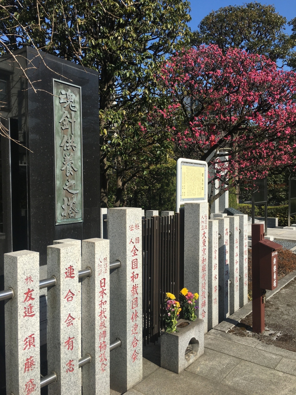 浅草寺境内淡島堂内には供養塔がありました。黒い石碑で、周りを石碑で囲み、たくさんの石碑には赤い文字が刻まれていました。塔という名前でしたが大きな墓石にも見えて、後方には小さな木々が立っています。建立の記の看板があります。