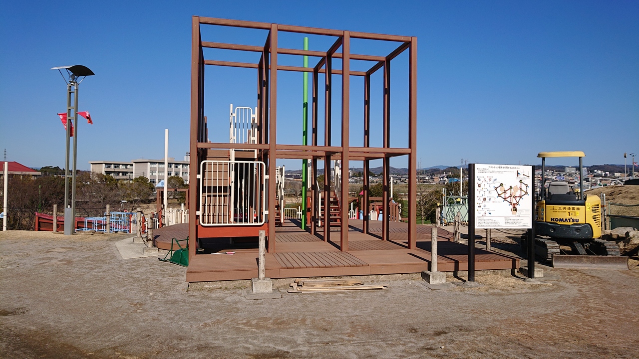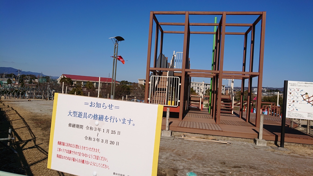 豊田市にある大きな公園です。敷地内には、豊田スタジアムも立地しています。公園内には、子供たち向けの遊び場として、大型遊具が設置してあるエリアが存在していますが、今回の訪問時には、しばらくの間、整備工事のため利用できない旨の表示がなされていました。