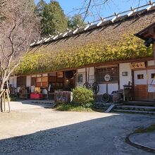 見学には入場料金が必要ですが、有料エリア手前の小さな広場や、お土産物屋さん及びカフェの利用には入場料金は不要です。入口の建物が、かやぶき屋根で出来ており、昔の山村における農家の家屋を彷彿とさせる造りとなっているのが印象的でした。
