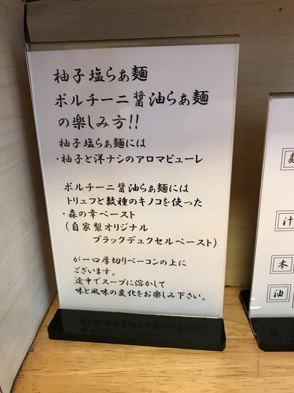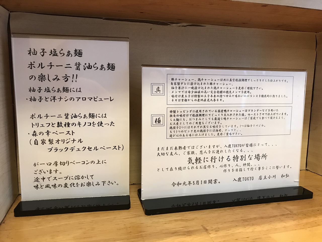 店内は高級料亭の感じ。ラーメンメニューは柚子塩らぁ麺(塩味)とボルチーニ醤油らぁ麺の2種類のみ。麺の大盛は無いので、お腹が空いているのであればごはん類を追加したほうが良いかも。今回は柚子塩らぁ麺に特製トッピングを追加。メンマも追加したがこれは別皿で提供される(これもめちゃくちゃ美味い!)