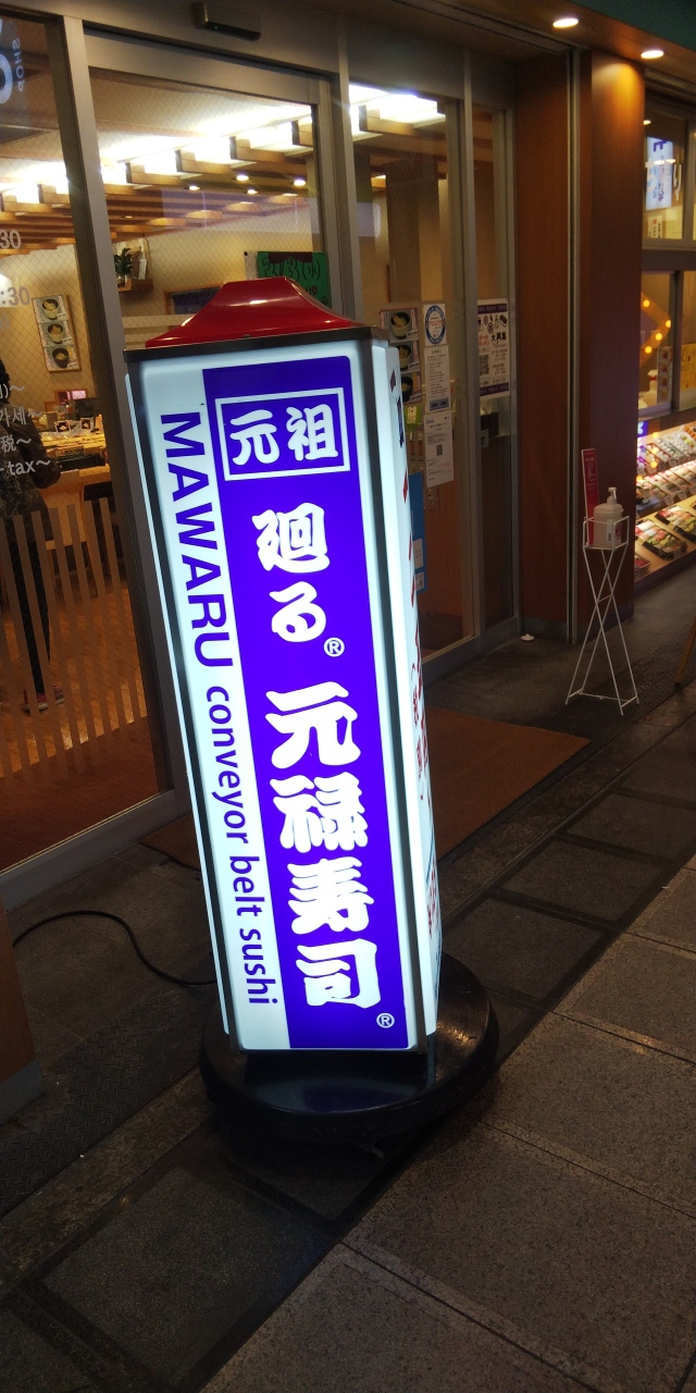 大阪の心斎橋筋商店街の中にある元禄寿司です。元禄寿司が回転寿司を始めた元祖だそうです。一皿120円ちょいで、○ら寿司や○シローよりちょっとだけ高めの設定です。平日の晩ごはんに会社の後輩とお邪魔しました。なかなかおいしかったです。
