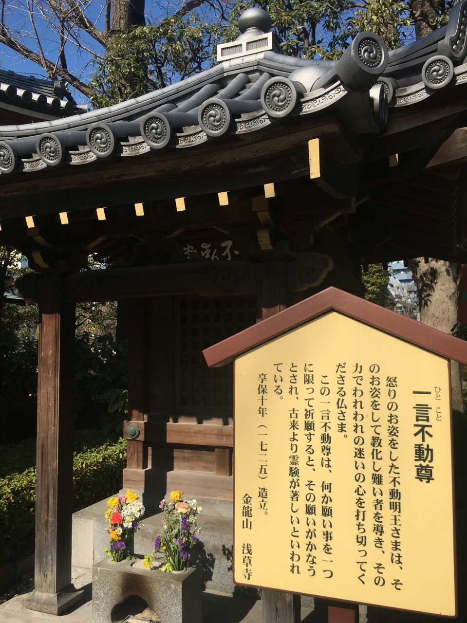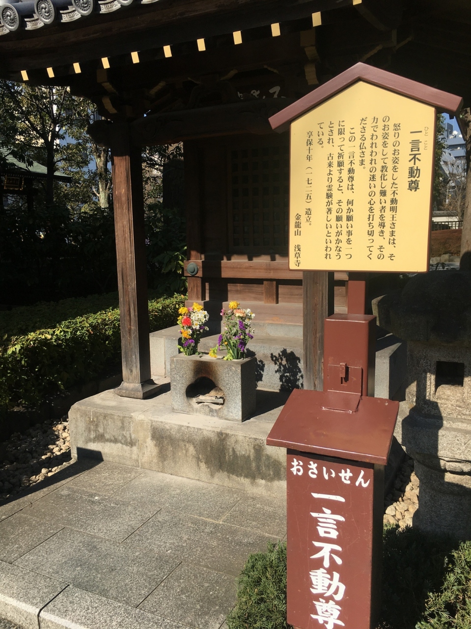 1725年に建てられた古いお堂で、何か一つの願いを祈願すると、願いが叶うときされるようです。石の台座に建っていて花が添えられ瓦屋根が大きかったです。三方を草木で囲んだ歴史を感じる建物で、人通りが多い浅草寺内にあります。