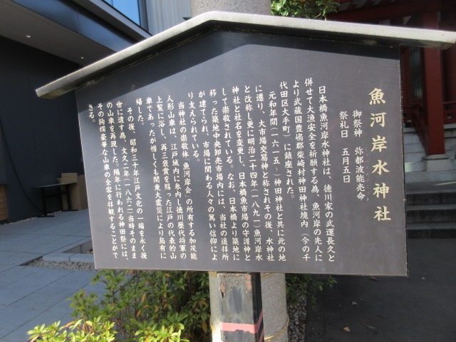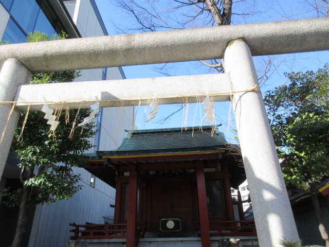 東京の神田明神の境内にある神社の一つで、場所は本殿左手側の横、比較的すぐの場所にあります。もともと日本橋に魚河岸があったそうで(今は築地、そして豊洲に移転していますが)そのころの神社だそうです。現在も魚河岸関係の方々の信仰が厚いとのこと。石の鳥居と祠があり、「水神」と書かれた看板が印象的でした。