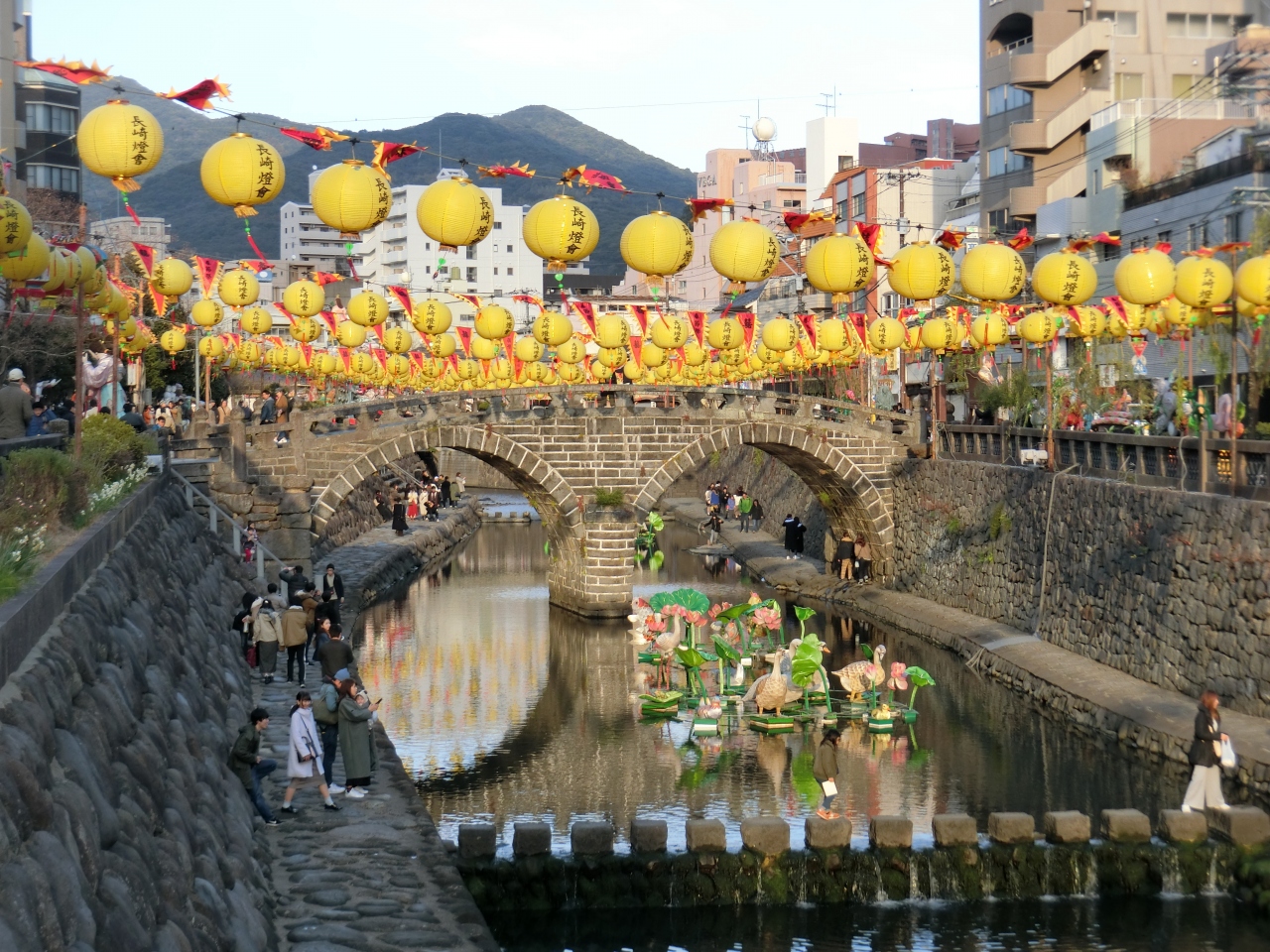長崎で有名な眼鏡橋。2連からなる石で造られたアーチ型の橋です。水に映ると本当にメガネのように見えます。ランタン祭りの時に行きましたが、眼鏡橋のまわりにも提灯、川の中にもオブジェが飾られ、夜になるとライトアップされてきれいでした。