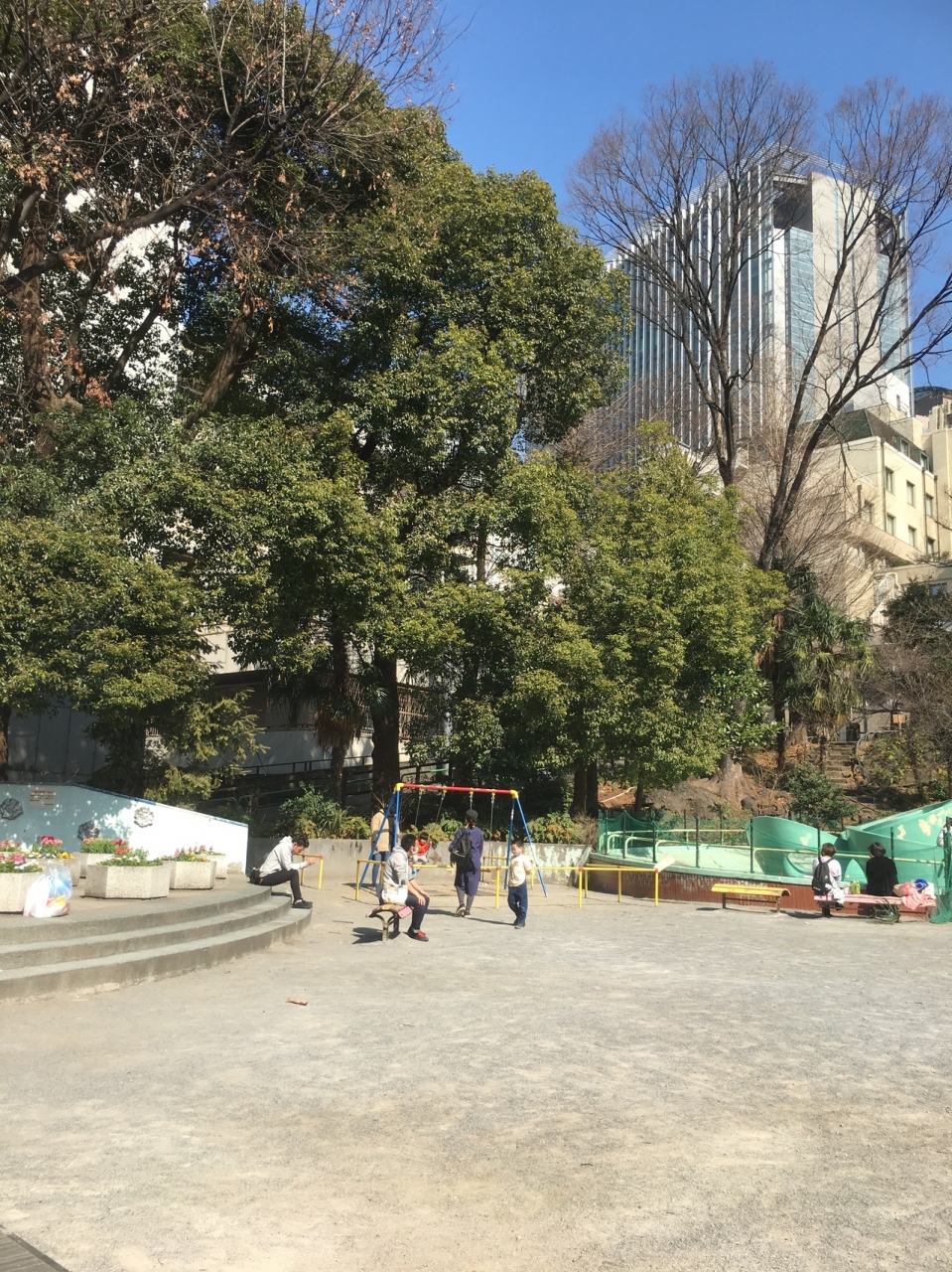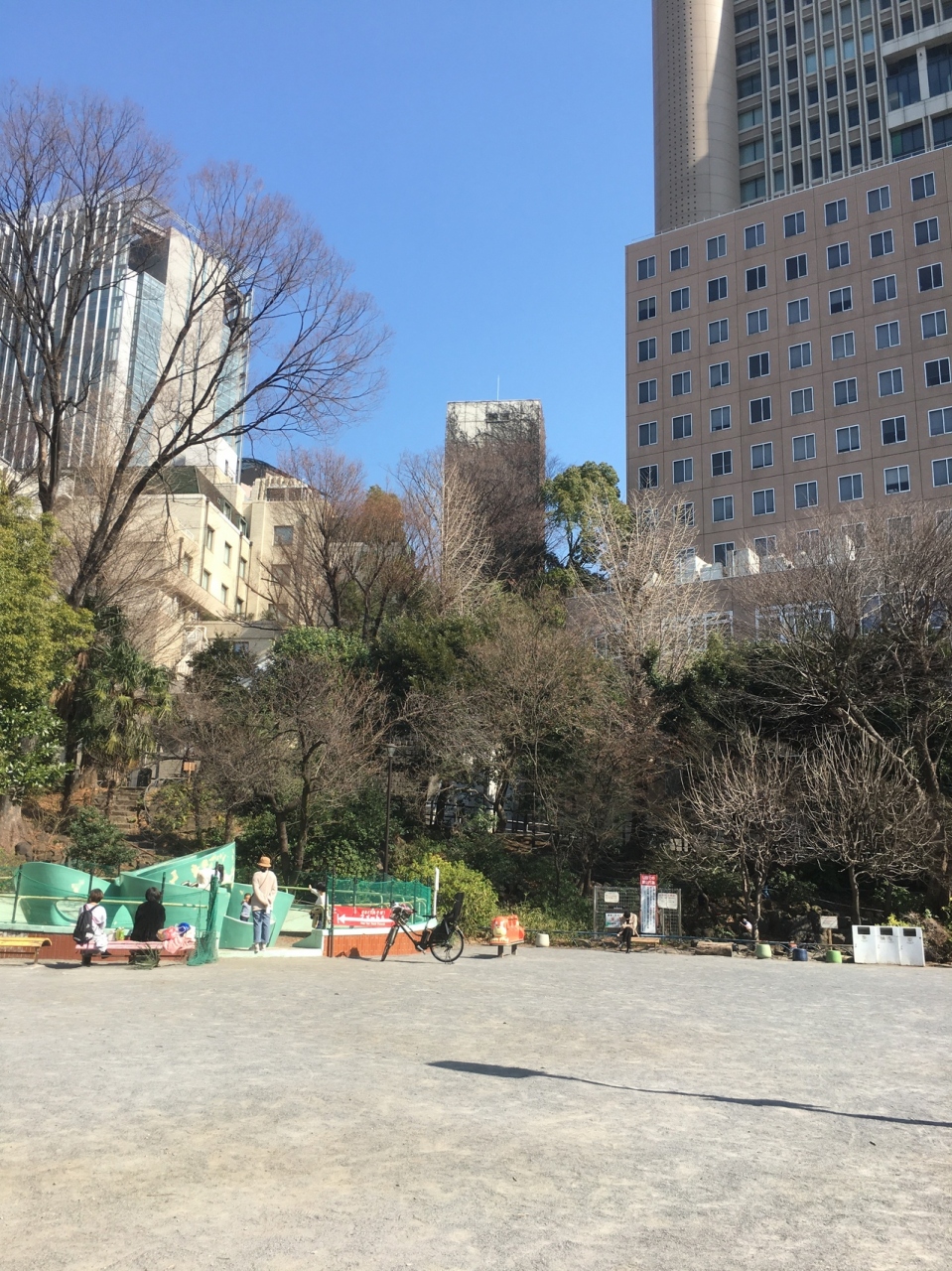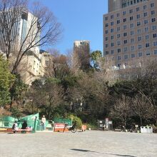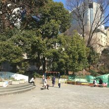 坂沿いにあるので上から公園内に入ると降って園内に入ることとなります。上部は木がいくつか立っていて林のようになっており、ブランコ等の子供の遊戯施設があるので家族連れが多かったです。ゴミ箱も置いてある公園です。