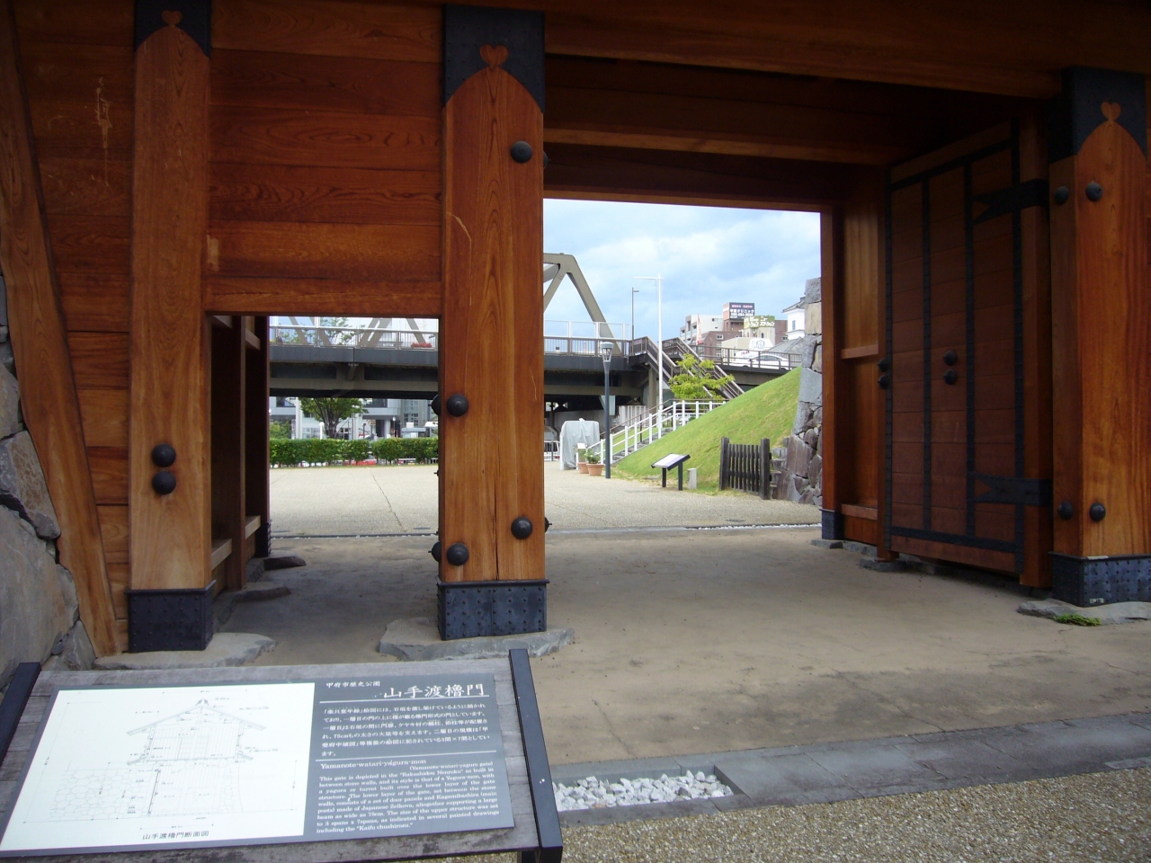 甲府駅北口にあります。甲府城跡は南口の舞鶴城公園にありますが、これは北口で離れた場所にあります。この門も甲府城の門の一つだったとのことです。復元されているので新しくてきれいです。無料なので、甲府駅で時間があまった時などに行ってもいいと思います。