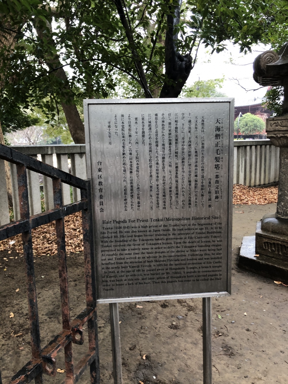 上野の森美術館に行った際、美術館のすぐ前にあったので立ち寄りました。立派な囲いの中にあり、花が供えられていたので、最初は著名な人物のお墓なのかと思いました。案内板を読んで、天海僧正の毛髪を納めた塔だということがわかりました。扉が開けられている時は、自由に見学ができます。