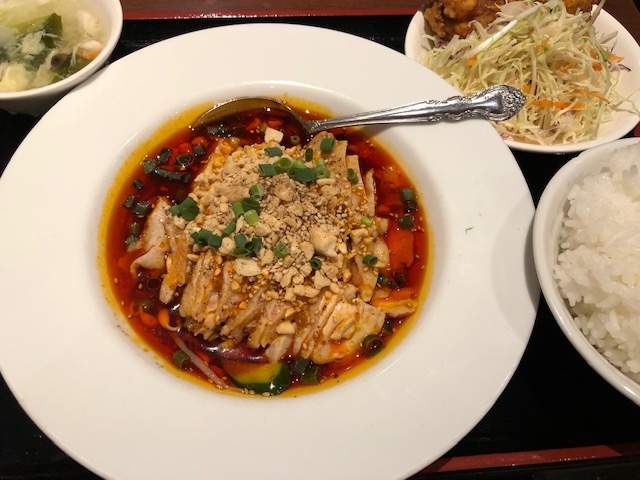 テレビで見て食べたかったよだれ鶏はピリ辛で美味しい!ご飯が進みますが、ビールにも絶対合いますね。ランチはスープやサラダ・杏仁豆腐もついてお得です。