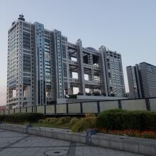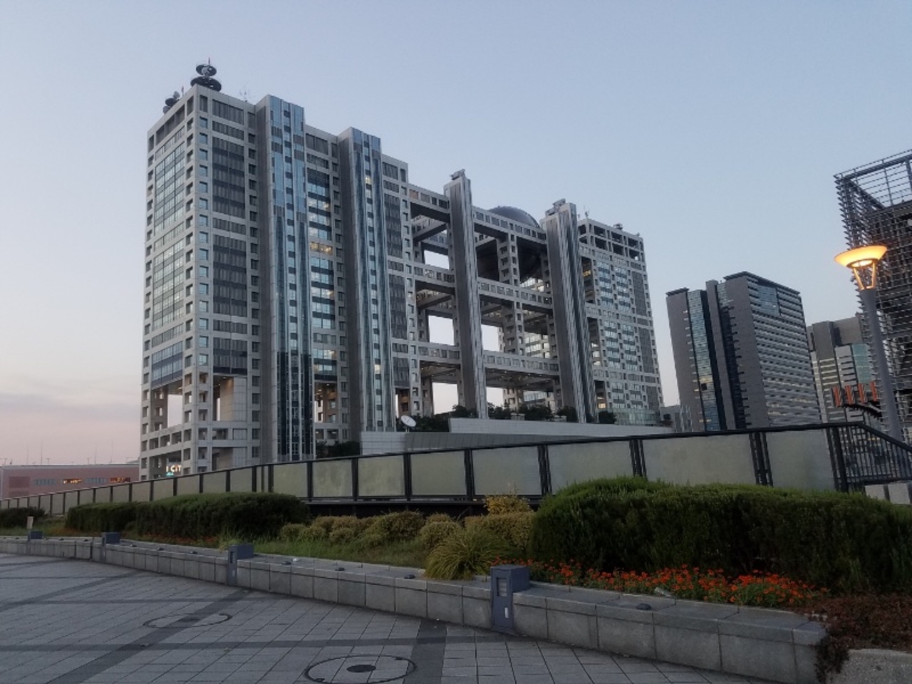 お台場にあります。横長の建物は16:9の比率だそうですがよく見ると2つの建物が空中の廊下で繋がっているのですね。丹下健三氏の設計と知り国際連合大学と窓の意匠が似ているなと思いました。ビルの膝元をゆりかめもが走っている姿を見たときにまるで映画の一場面のような近未来感を感じました。