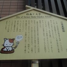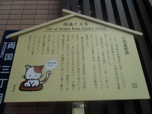 それによると、江東義塾は夏目漱石が明治19年(1886)から約1年教師をしていた私立学校で、この辺りにあったそうです。