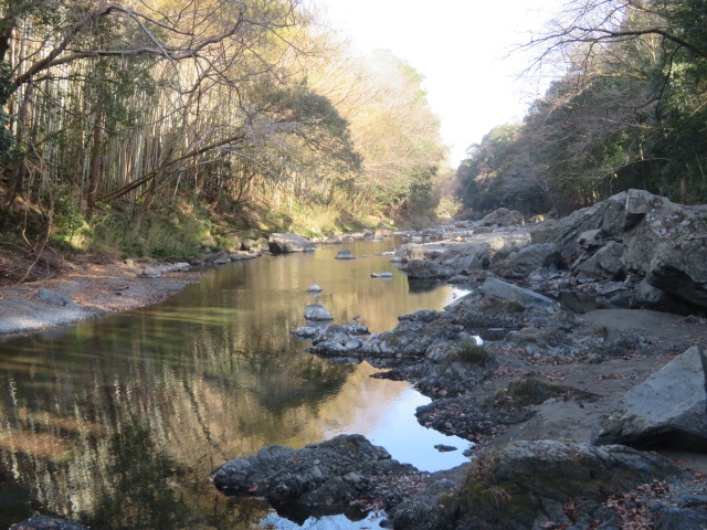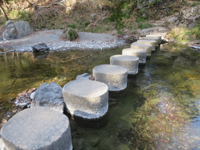 天覧山・多峯主山を歩いた後に吾妻峡(あづまきょう)に出ました、人工の飛石、ドレミファ橋(巾着田そばにもありますがここが元祖)を歩いて対岸にある遊歩道に出て川沿いを歩きました、赤岩、兎岩、汽車渕など見ながら中平河原に、大沢橋、苔台大橋を渡り吾妻峡入口バス停に着きました、歩いている人は少なかったです。