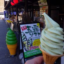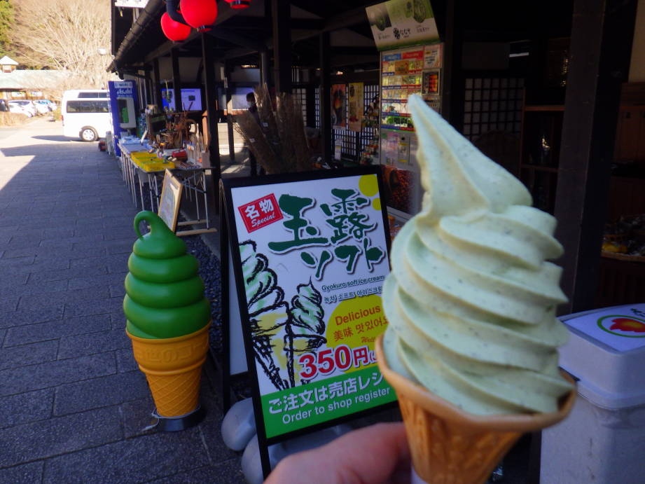 道の駅「風のマルシェ御前崎」から1時間10分ほどで道の駅 「玉露の里」に到着しました。名物の「玉露ソフト」350円をいただきました。ちょっと緑のつぶつぶの入った「玉露ソフト」は一口食べるとお茶の風味と渋みが口の中に爽やかに広がって、牛乳ソフトの甘みとマッチしていてとても美味しかったです。