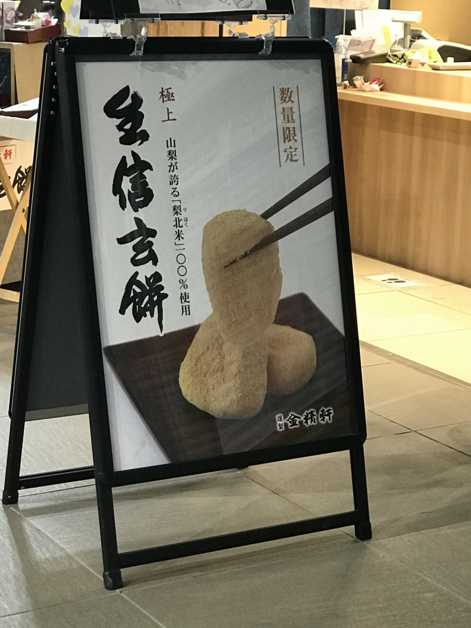 信玄餅が有名なのだが、ここの信玄餅は素材にこだわっていて、北杜市で生産された梨北米、甲斐駒ヶ岳の伏流水を使った高級バージョン。甘さ控えめだが、逆に求肥の味がちゃんとする。ちょっとしたご褒美におすすめ。