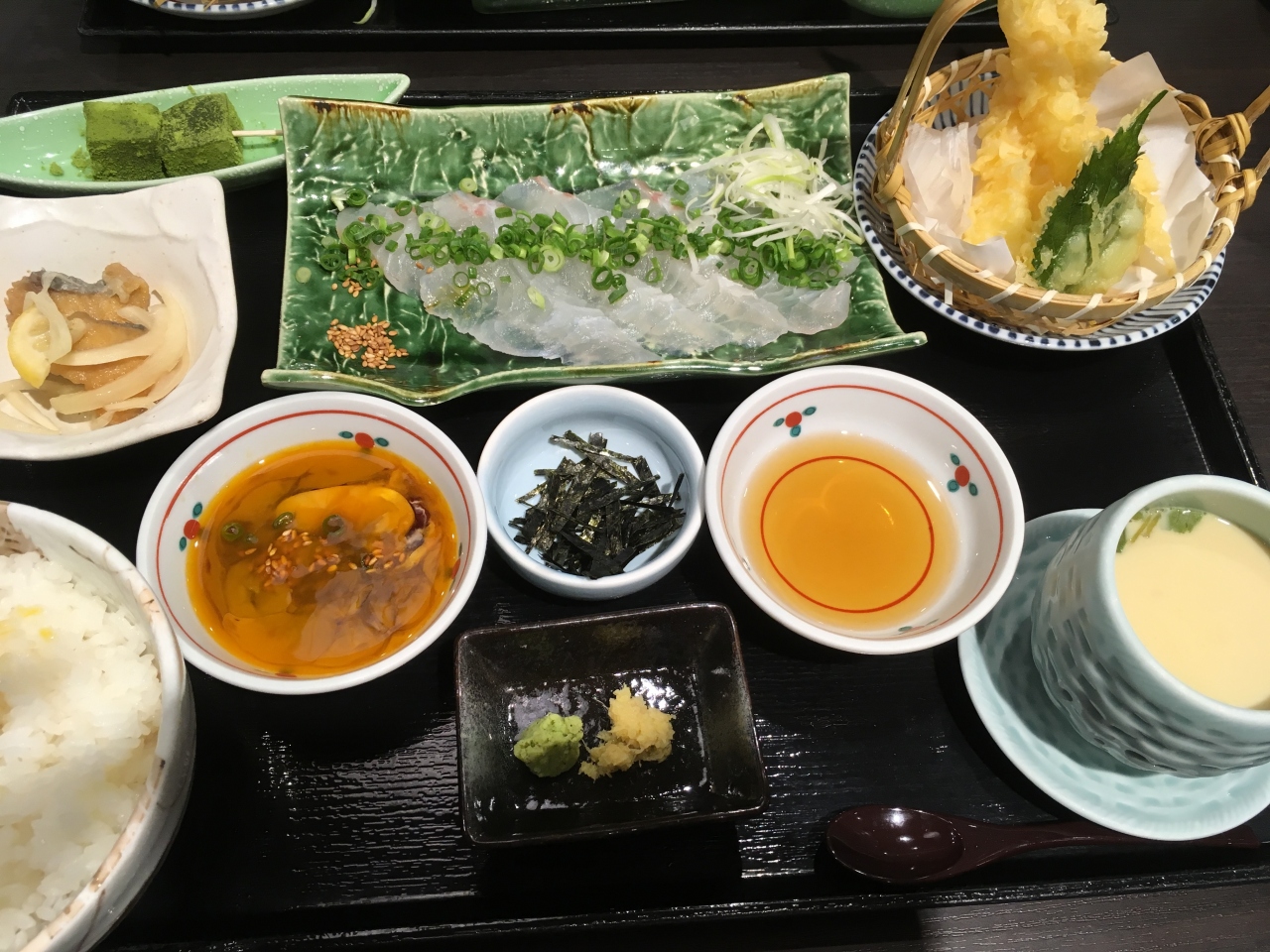 久しぶりに日進市の竹の山に行きました、いつの間にか沢山のレストランが出来ました、すし御殿もありました、丁度寿司を食べたかったので入りました。しかし寿司ではなく和抹茶わらびもちに心を奪われました、結局鯛茶付のランチセットを注文しました