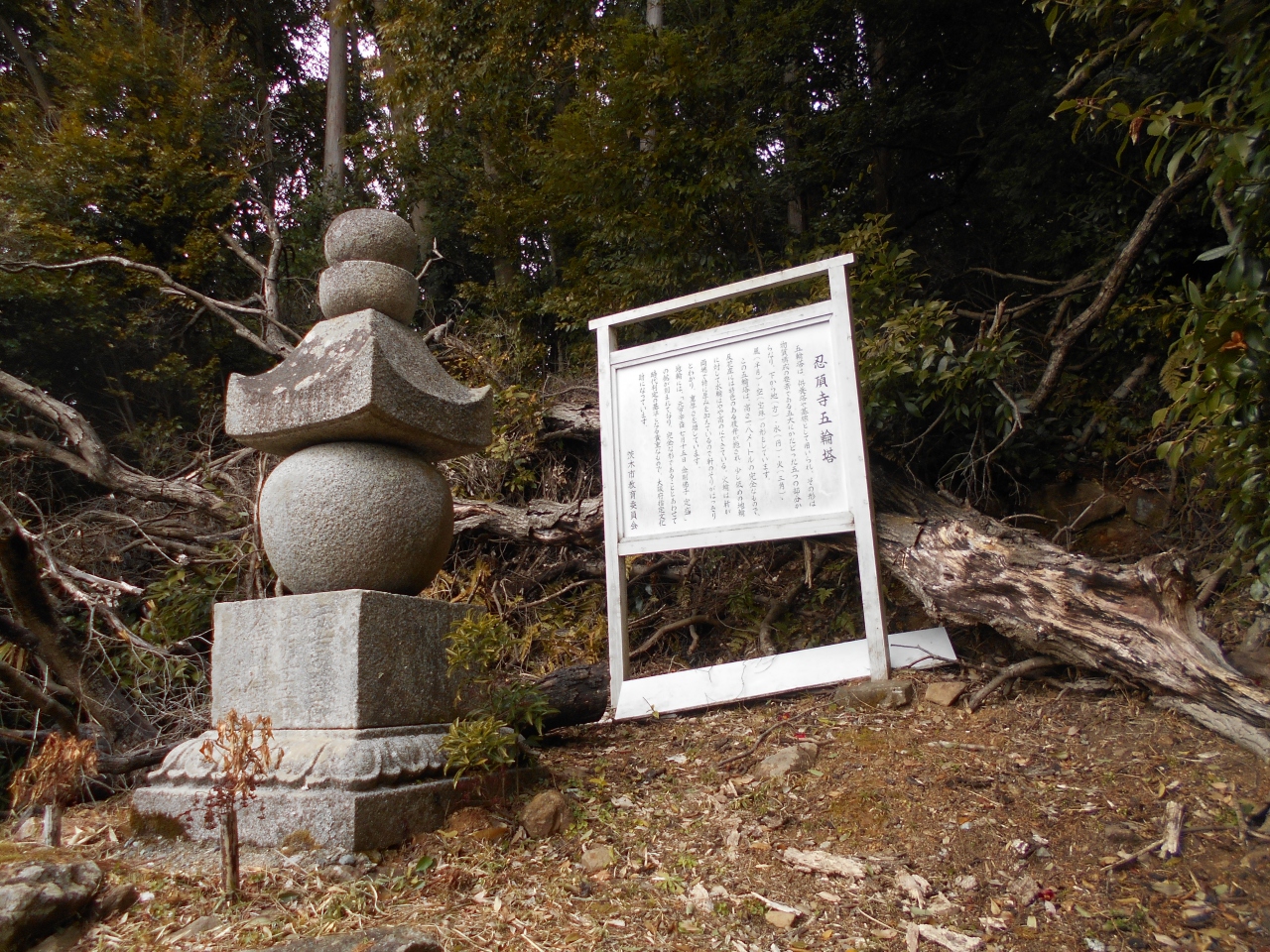 忍頂寺にある大阪府の指定文化財です。五輪塔というのは物質構成の要素である五大に方同った五つの部分からなる。下から「地」「水」「火」「風」「空」の形をしているという。この塔は完全な形をしていてつくられた時代も下に刻んであるのでわかる。貴重なものという。