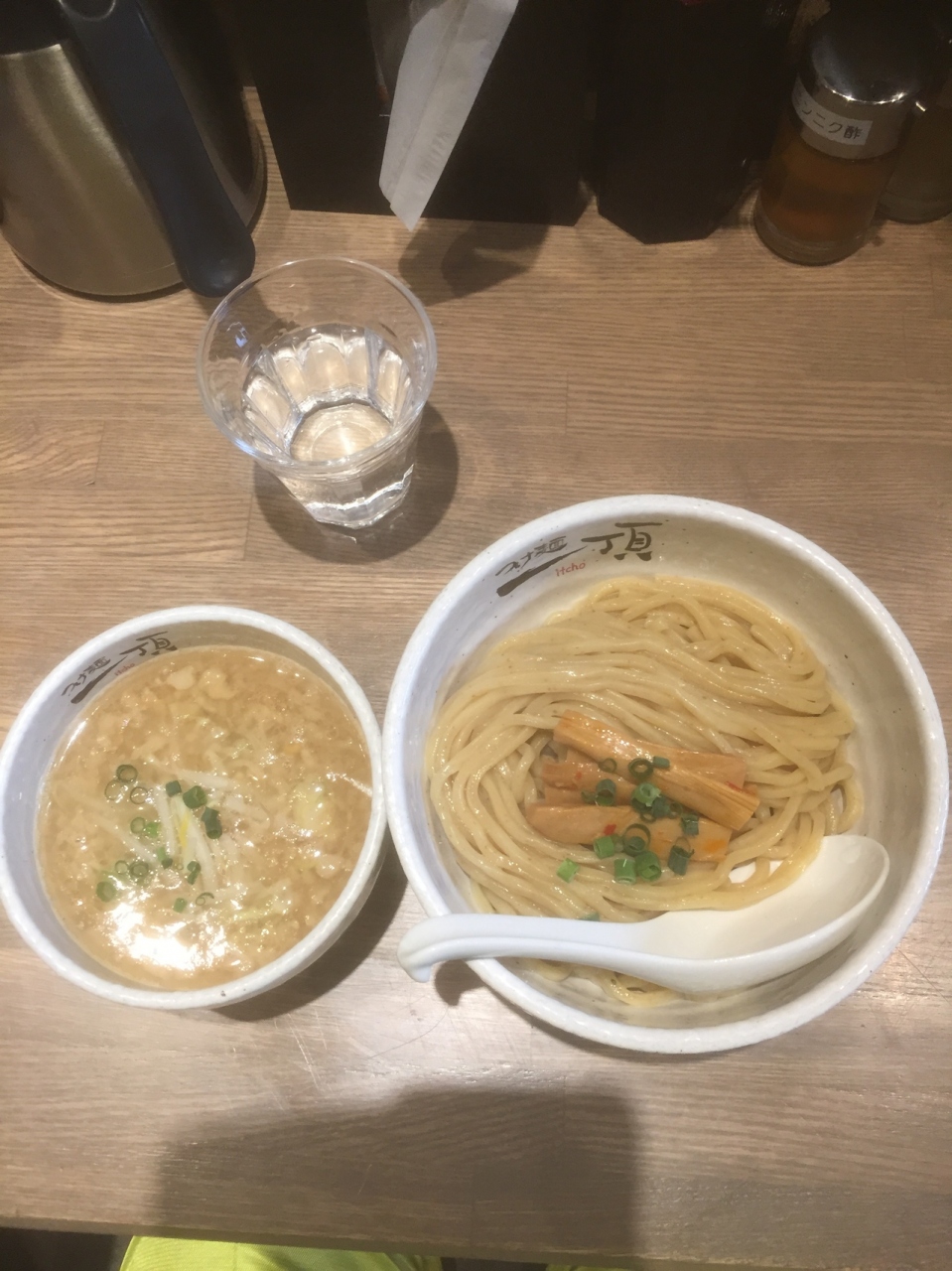 京成船橋駅近く、フェイスビル1Fにあるカウンターのみのお店です。つけ麺、濃厚つけ麺、エビつけ麺、ニンニクつけ麺、辛つけ麺とメニューがあります。麺は、普通、中盛り、大盛り、特盛りと選ぶことができ、値段はかわりません。男性が大盛りを注文してたので大盛りを注文しました。濃厚なスープでうまかったです。ニンニクつけ麺を注文。