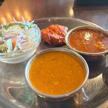 ランチタイムは2種類のカレーにサラダ、タンドリーチキン、ドリンクとナンかライス(1回お替りok)で1000円とお得です。