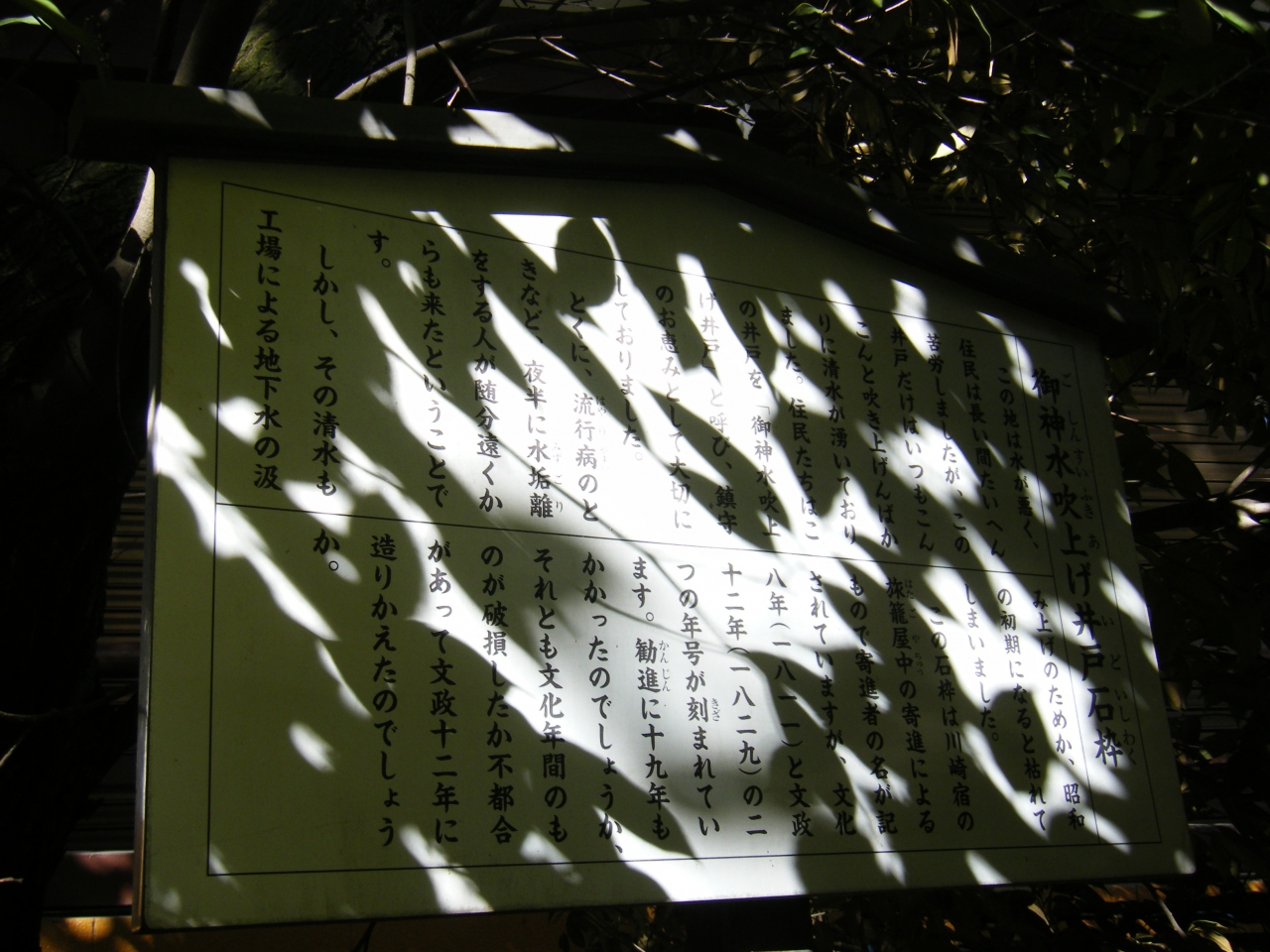 2020年11月に川崎を散策した際に立ち寄りました。JR川崎駅から徒歩10分ほど、国道15号線沿いにある稲毛神社境内に御神水吹上井戸石枠はあります。案内板も整備されており、それによりますとこの辺りは水が非常に悪くて昔から苦労していた場所でしたが、この井戸の水だけは飲用に適した綺麗な水が湧いており、流行り病の際などには多くの人を救ったとされているそうです。その綺麗な湧き水も、昭和に入ると川崎付近の工場化により水が湧き出なくなり枯れてしまったそうです。川崎で湧き水が出ており、飲めた時代があったということがとても信じられない話ですね。