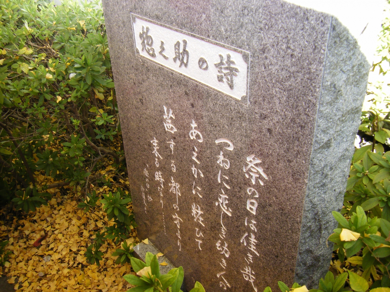 2020年11月に川崎を散策した際に立ち寄りました。JR川崎駅から徒歩10分ほど、国道15号線沿いにある稲毛神社境内に佐藤惣之助「祭の日」詩碑はあります。佐藤惣之助は明治から昭和にかけて活躍した詩人で、川崎生まれということで川崎には彼にちなんだ史跡がいくつかあるようです。稲毛神社境内にある「祭の日」は本殿のすぐそばにあります。ただ、訪問した日はテントで熊手などの売り出しを行っており、ちょうど碑文が隠れるようにテントが立てられていたので見つけるのが大変でした。この場所で初めて佐藤惣之助という人物を知ったのですが、調べていくなかで、阪神タイガースの「六甲おろし」も彼の作詞ということを、初めて知りました。
