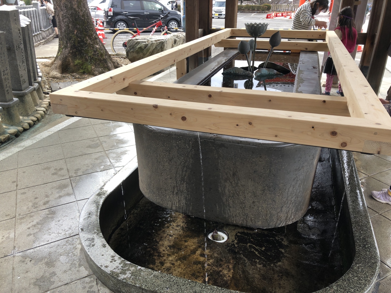 我が家は毎年1月に車の御祈祷をここで行っています。正月3が日はかなりの人出になり、駐車場までの道も渋滞必至です。でも、仕事始めの頃になると平日なら割とスムーズに行けるようになりますよ。御祈祷の時間までに本殿にお詣りします。本殿へは階段を登って行きます。この階段は、かなりきついですよ。なお、今年はコロナの影響で、手水舎の柄杓がなくなって、その代りに木枠から水が流れるように工夫がされていました。