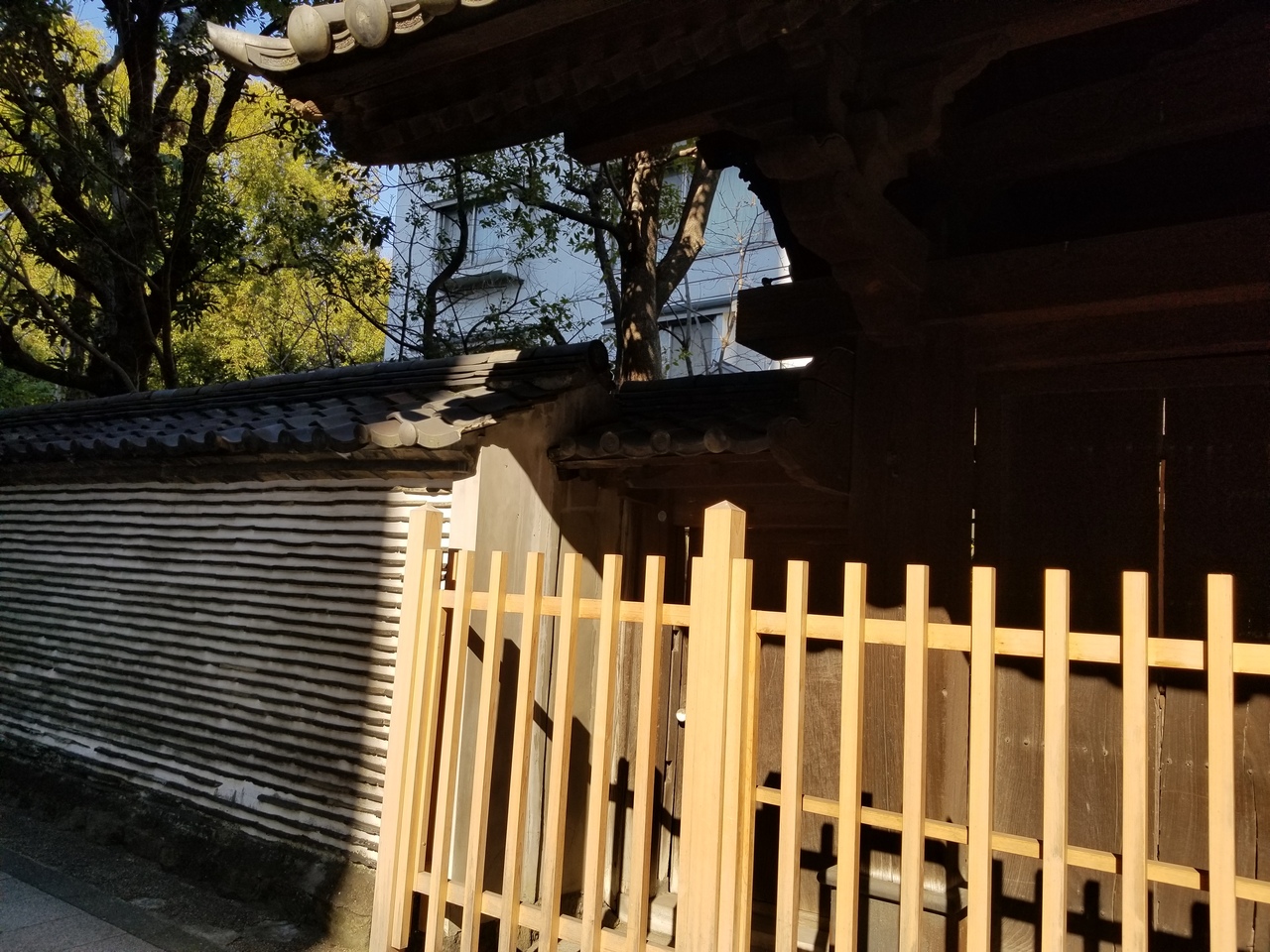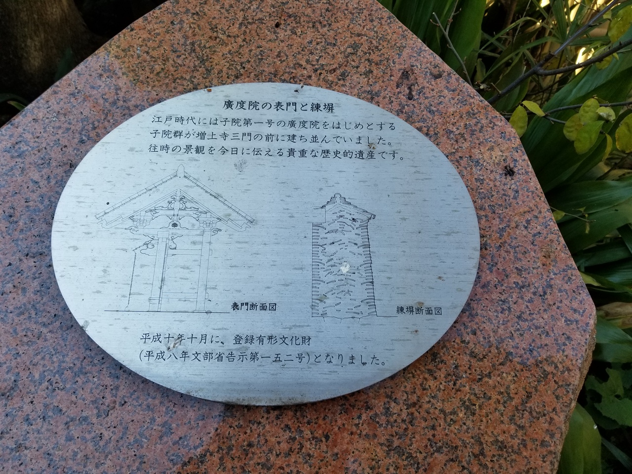 増上寺境内の子院の一間一戸の薬医門と塀である。練塀は底部に間知石を置き,芯柱を用いずに土と瓦を交互に積み上げて壁体とする構造で,現在では用いられることがない。