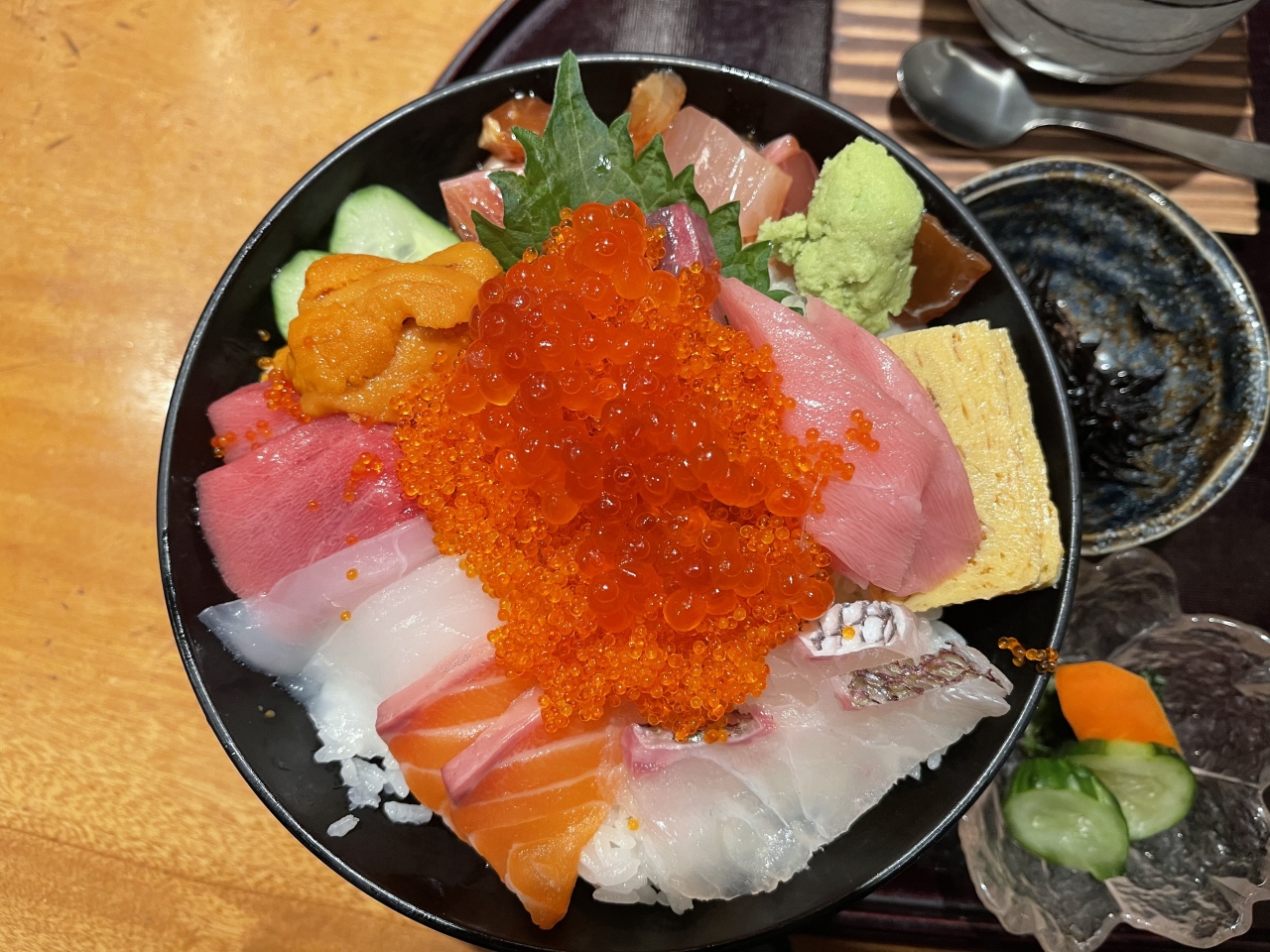 限定の2千円ぐらいの海鮮丼を注文。12時前に行ったが、十人以上の列。行列で有名。海鮮丼にはバラコが大量に載っていて壮観。刺身も鮮度抜群。バラコが刺身に載っているので、よく言えば塩気がプラスされ、言い方を変えれば刺身に少し味が混ざる。
