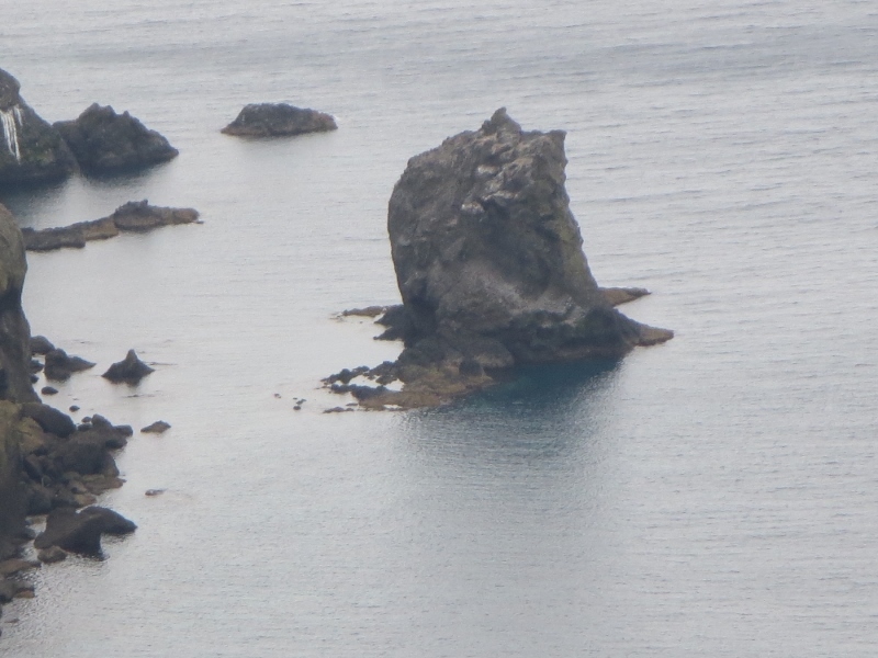 桃岩展望台辺りから見ました。猫が海の方を見ている後ろ姿に見えました。桃岩の辺りも人が少なくて、歩くのが楽でした。いつもの夏なら観光バスで見学に来る人も多いそうです。心なしか猫が寂しげに見える気がしました。