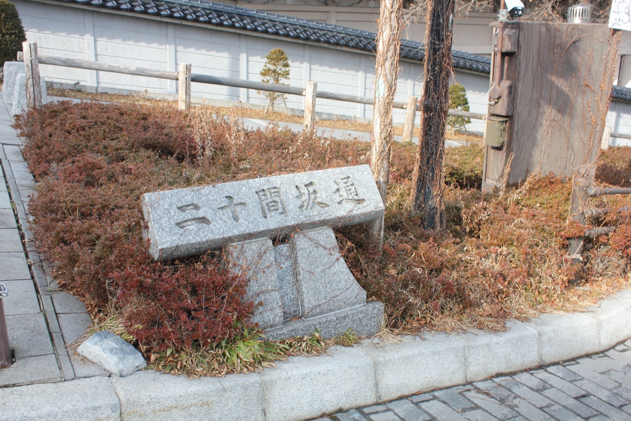 函館駅前から南西へ向う開港通りの延長にあり、十字街から函館山麓をつなぐ坂の一つで、道路幅が約36m(二十間)もあることから二十間坂と呼ばれています。
