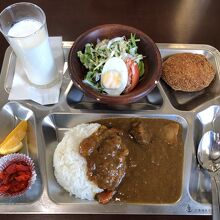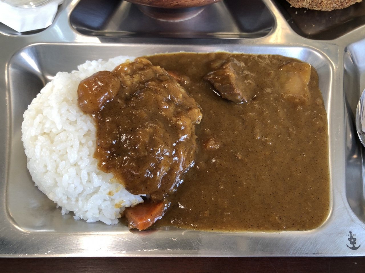 今回は「護衛艦はまぎり」が監修した「海自カレー」をオーダー。すりおろし林檎をたくさん使用した甘みと酸味のあるビーフカレーで、スパイスも効いていて、見た目よりも大人のカレー。珈琲や生クリームが隠し味とのこと。付け合わせの「大湊海軍コロッケ」は、海軍割烹術参考書のレシピを再現したビーフコロッケで、塩、胡椒のみで味付けをしたシンプルなもの。ソースをかけないので、芋そのものの味が楽しめます。