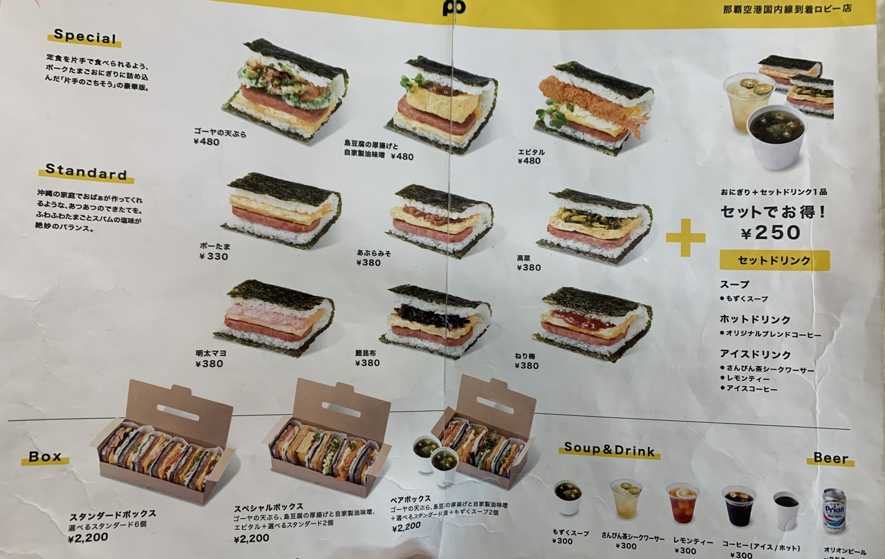那覇空港、国内線到着ロビーにあるポークたまごおにぎりのお店。ポーたま330円、その他明太マヨ、あぶらみそ、高菜等が380円、スペシャルのゴーヤの天ぷら等が480円です。2200でボックス・セットもあるので家族数人でシェアするのも○。間違っても1人では頼まない方が良いサイズです。味はもちろん◎。那覇に来たら1度は食べてみた方が良いですね