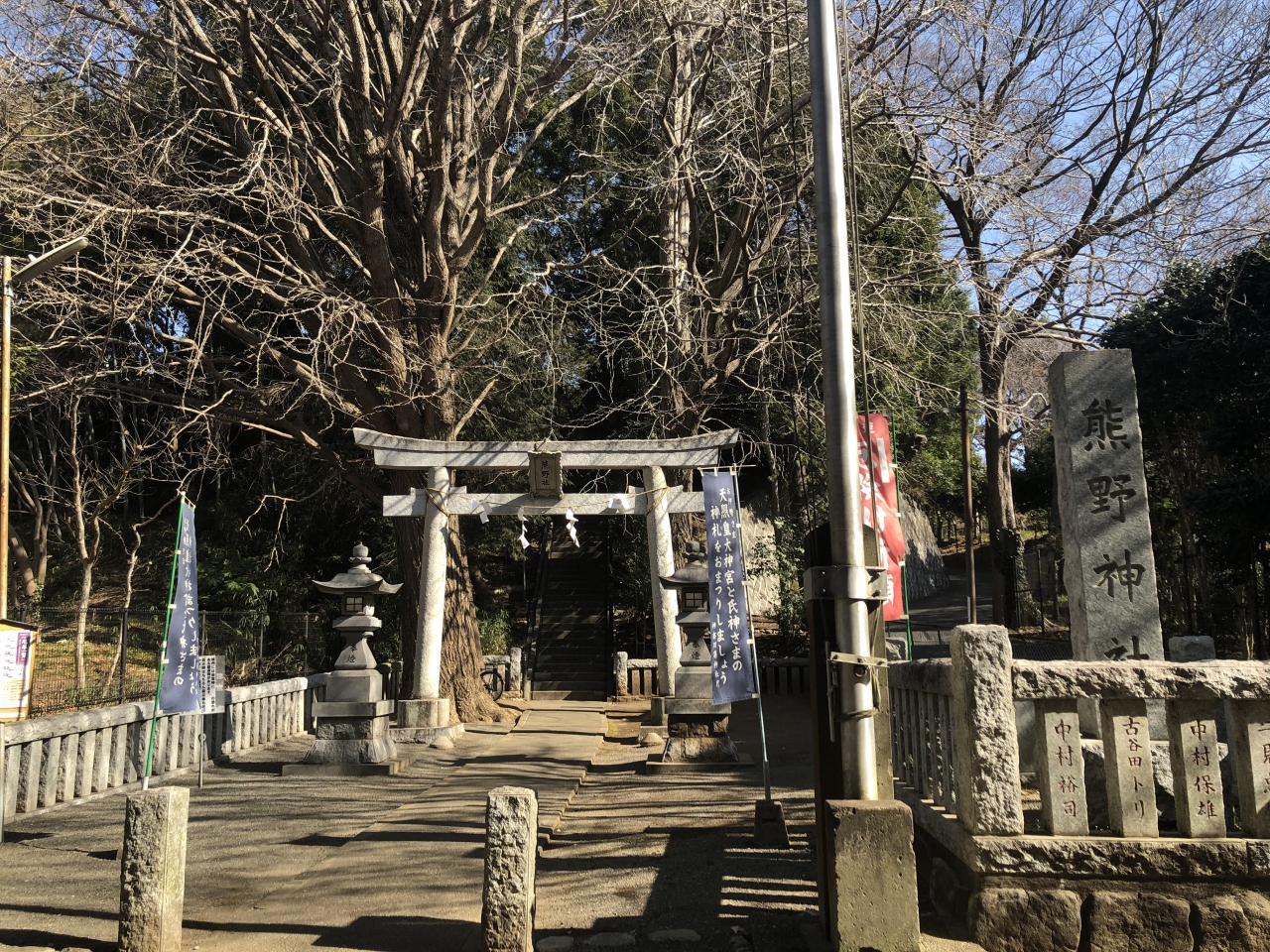 小田急線・相鉄線の大和駅から歩いて12分、ふれあいの森の東側に隣接してある神社です。ふれあいの森の中にある東ヶ里緑地の近くに「熊野社」という扁額がかかった鳥居があり、その先に社殿へと続く石段があります。社殿には、熊野神社の社紋が見られます。