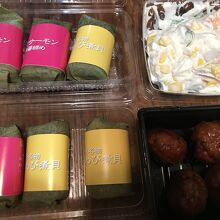 和洋中の弁当、お惣菜がありますが、甲州名物のあわび煮貝や甲州サーモンを使った笹寿司があってお土産や車内での軽食に手軽でおすすめ。