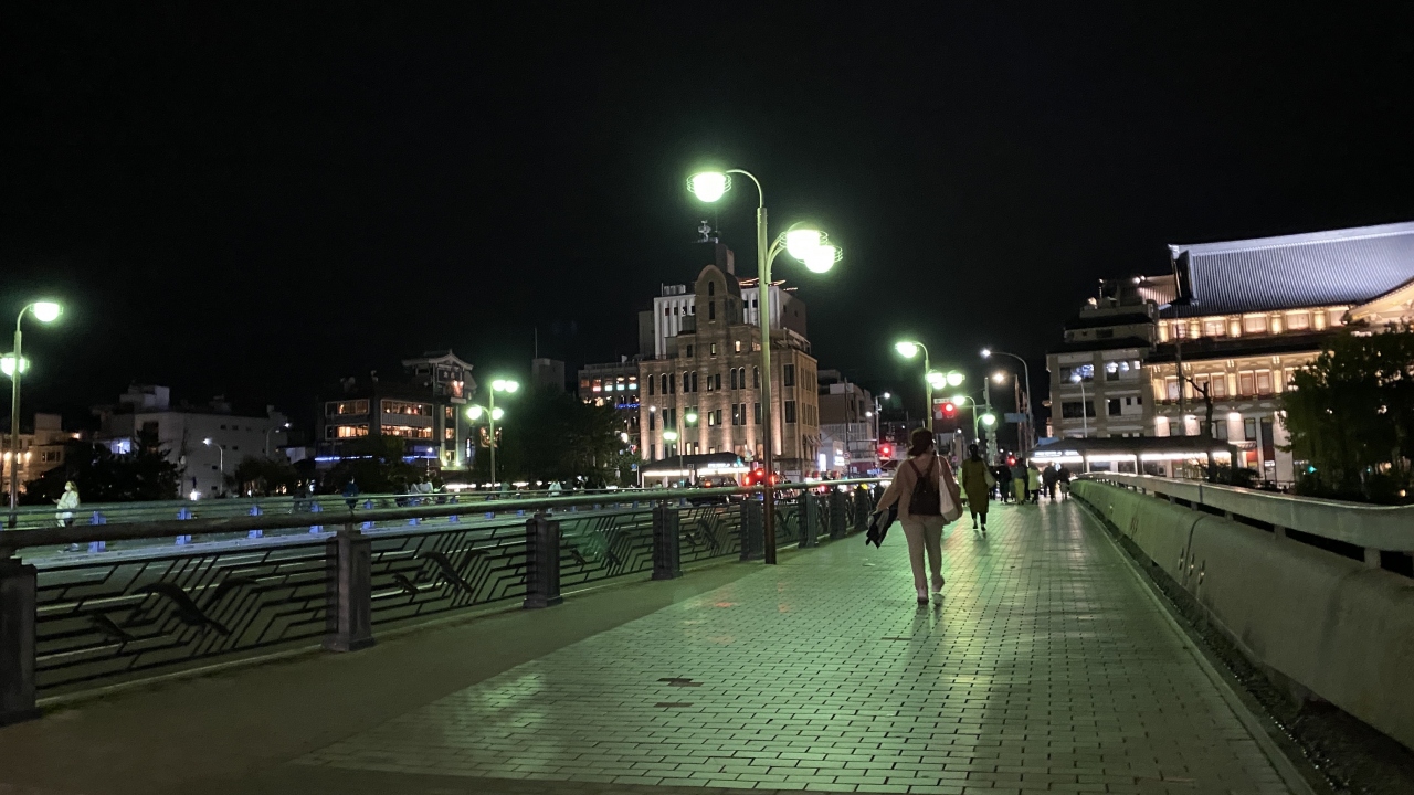 京都の目抜き通りの四条通にかかっている四条大橋。川沿いの景色もきれいに眺めることが出来ますし、歩道もスッキリと広くとってあるので、散歩にもいい場所です。この橋は阪急と京阪の乗換通路にもなっているので、観光シーズンや土日は非常に混雑します。