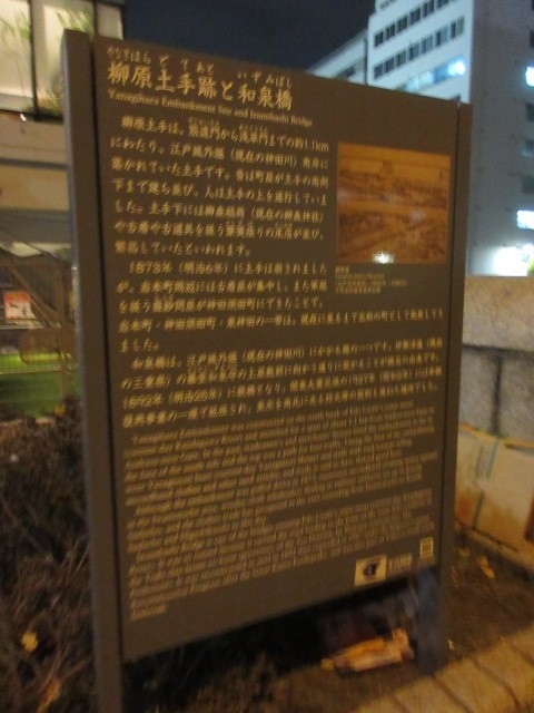 秋葉原周辺の神田川沿いを散策していた時に発見しました。場所は神田川にかけられている、和泉橋という場所周辺で、この辺りに江戸時代は「柳原土手」という土手がつらなっていたそうです。太田道灌が柳を植えたことからこの名称になったとのことで、徳川吉宗も柳を植えさせたそうです。現在も説明板が残っていますし、近くに神社もありました。