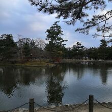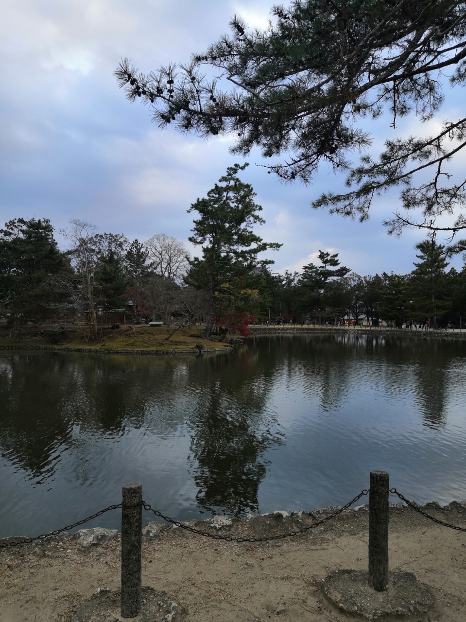 大仏殿と隣接する場所にあるので東大寺に来たならほぼ通りかかるエリアにあります。池にある小島が柄の付いている鏡のような形状をしているところからこの名称になったそうです。池には奈良県の天然記念物の魚であるワタカが生息しているそうですが、夕方で明るくなくよくわかりませんでした。