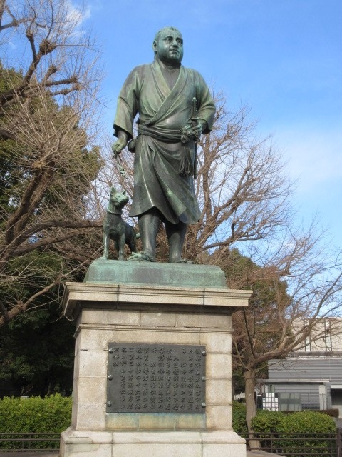 上野公園に建っている大きな銅像です。日本の銅像の中でも特に有名な銅像で、犬と散歩している日常の西郷さんをイメージした感じのものです。天気のいい日でしたので青空に映えて特に立派でした。台座も含めるとなかなかの大きさなので見上げる感じになります。