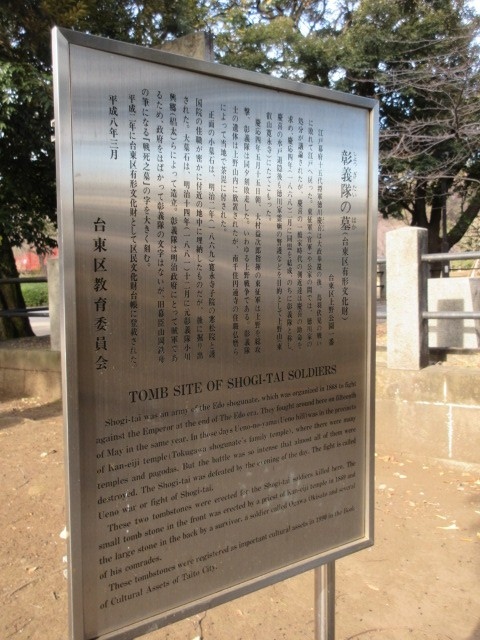 上野公園にあります。西郷さんの銅像の近くにあるのですが、西郷さんほど目立たないので、素通りしてしまう人もいるかも。ひっそりとしてはいるものの、とても立派なゾーンです。大きなお墓の石もあり、石碑もいろいろ。さらに、親切な説明板もあるので、勉強にもなります。