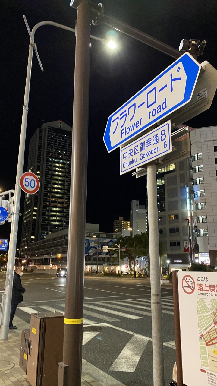 三宮エリアでも有数のビジネス街であり繁華街のフラワーロード。新神戸駅、三宮駅と交通の要所がここに揃っています。いまは名前の由来になった花時計が移動していたり、市役所の工事などがありますが、夜間でも人が多い場所です。