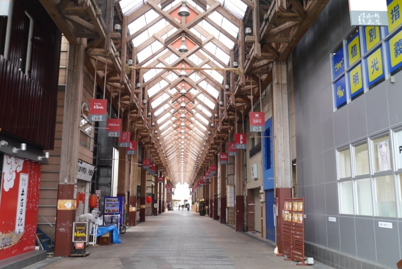 はりまや橋からスグの商店街。よさこい会館に行くにはこちらからが便利です。アーケードが独特で、写真のとおり、木組み〜な感じでデザインされています。しかしながらひろめ市場や高知城、はりまや橋などとは反対方向にあり、観光客としてはわざわざ訪れないと通ることはあまりないかと思います。お店の数も少なめ。