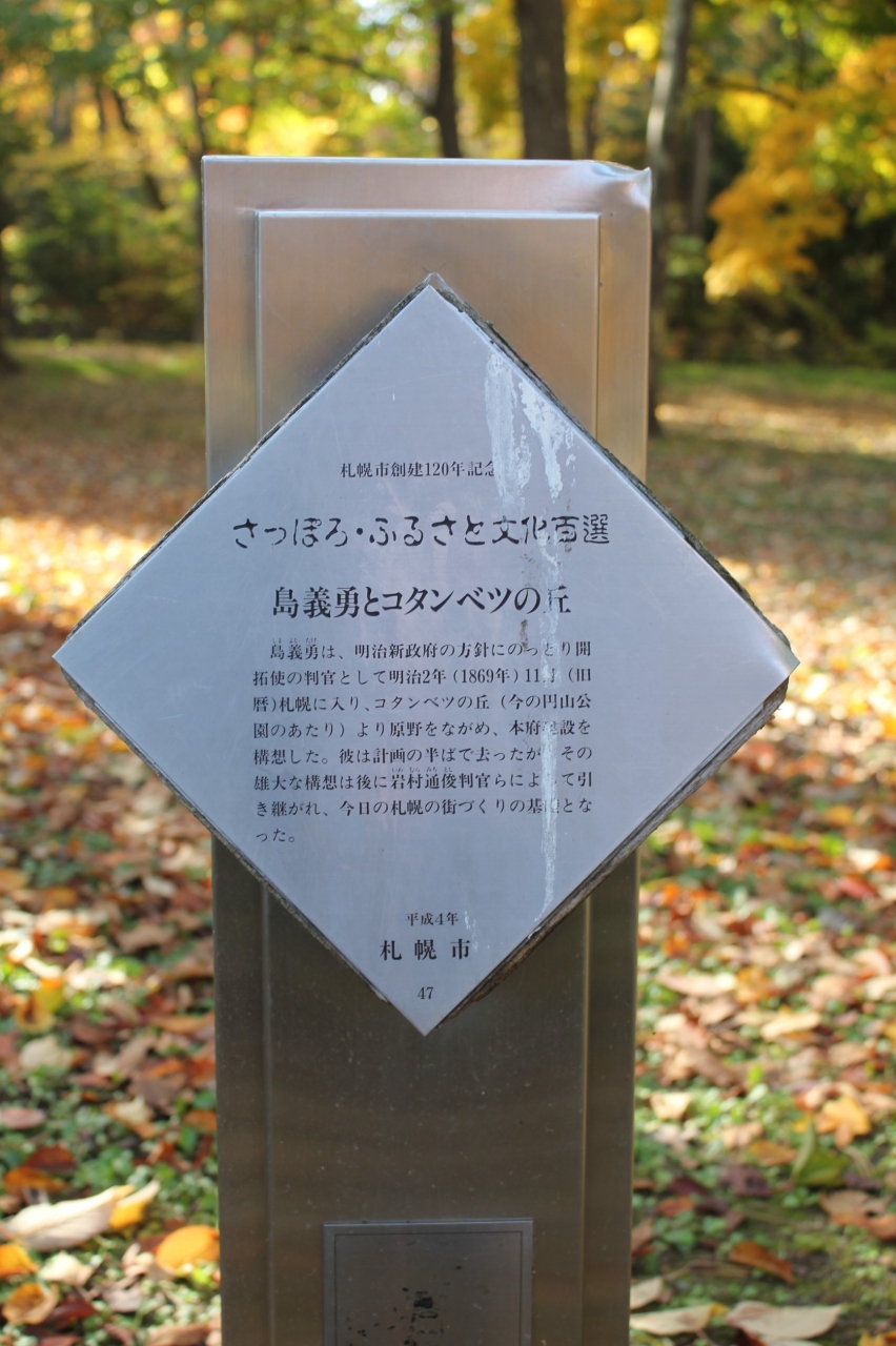 近くにある説明板によると、「島義勇氏はコタンベツの丘から原野を眺め建設を構想した」とあり、かつてこの一帯が「コタンベツ(円山)の丘」と呼ばれていたそうです。