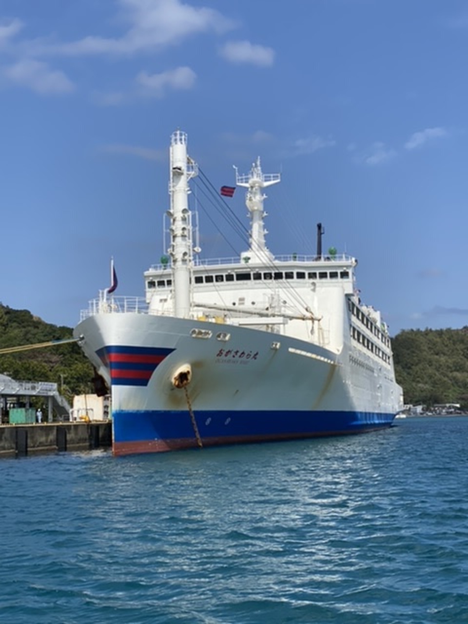 竹芝から父島までおがさわら丸で24時間、到着するのが二見港です。父島、小笠原諸島の玄関口ですね。