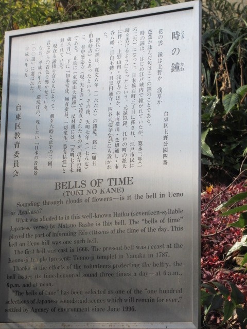 上野公園内にあります。場所は上野の大仏様の少し先当たり、坂の途中です。上野の寛永寺の時をあらわす鐘で、江戸時代から惣菜することのこと。現在のものは再建だけど、それでも江戸時代のものだそう。すごい歴史ありです。ちなみに今でも時間をこの鐘を鳴らすことで知らせている、現役のものです。